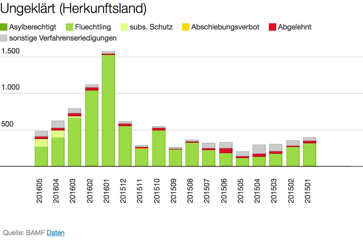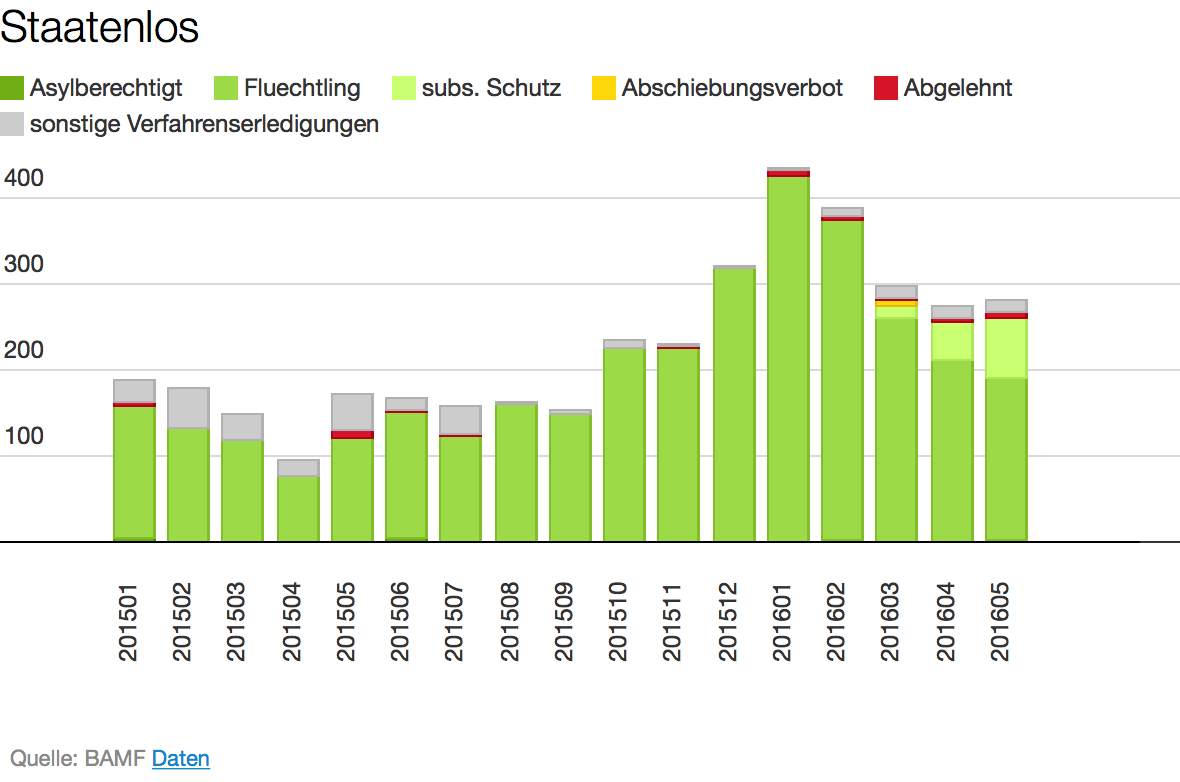 15 – Staatenlos. Das sind wie die „Ungeklärten“ vor allem kurdische oder palästinensische Volkszugehörige, die aus Syrien stammen (Quelle: https://fragdenstaat.de/anfrage/herkunftsland-ungeklart-und-staatenlos-in-der-asylgeschaftsstatistik/):