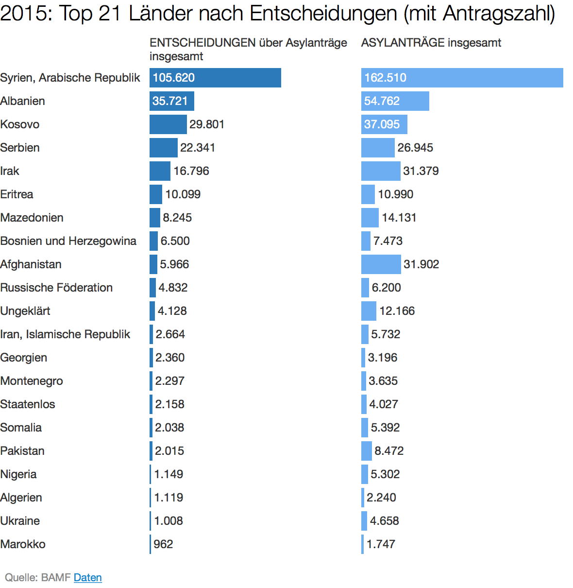 Hier noch eine – erst einmal unkommentierte – Sammlung von Entscheidungshistogrammen. Hier und auf Entscheidungen pro Land seit 2015 haben wir die 21 Länder dargestellt, zu denen 2015 die meisten Entscheidungen getroffen wurden. (Die Top 20 der Asylanträge sind etwas anders. Es gab beispielsweise aus Afghanistan viele Anträge, aber wenige Entscheidungen darüber.)