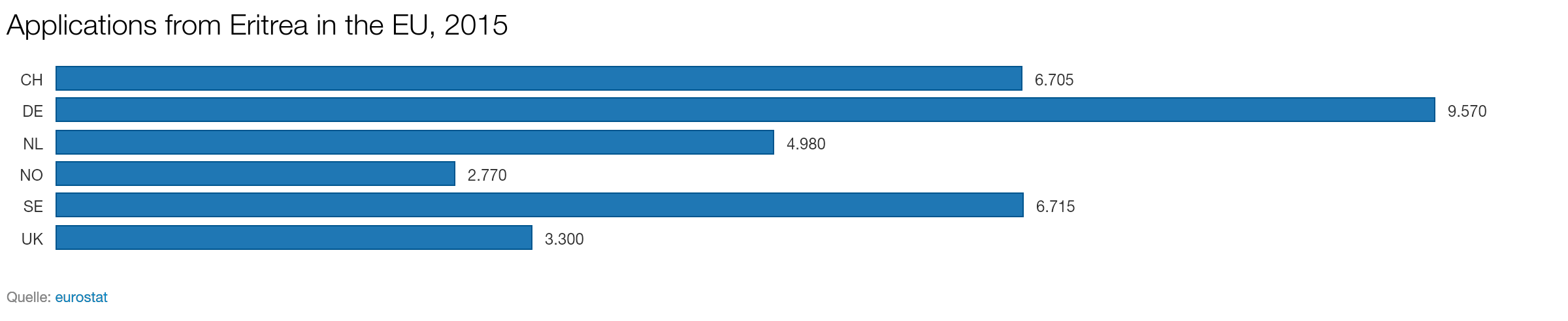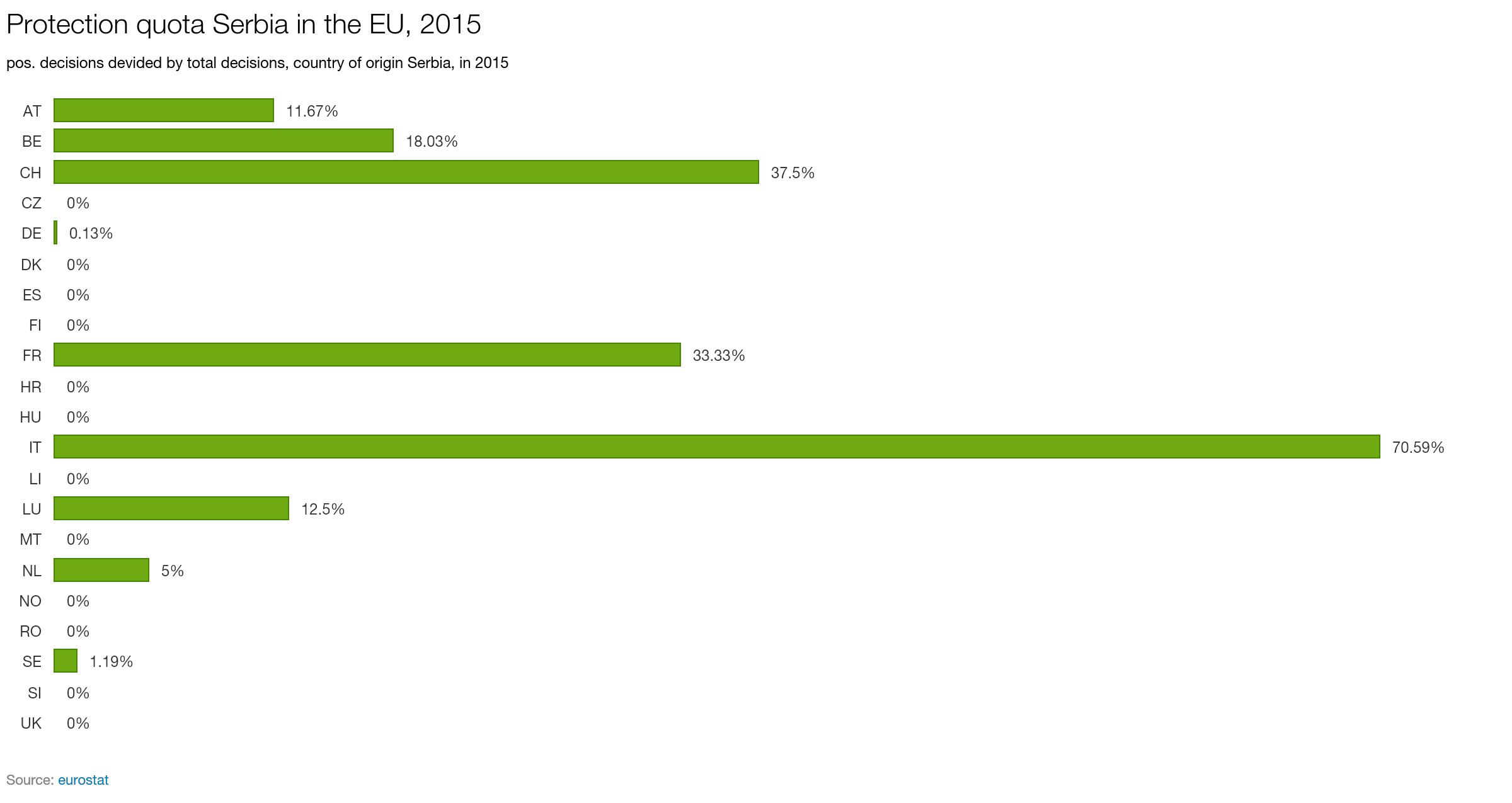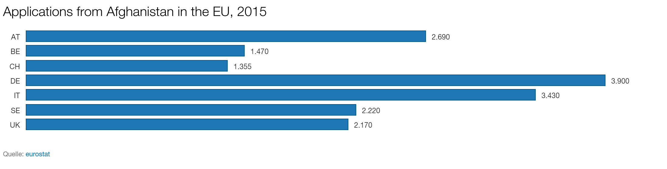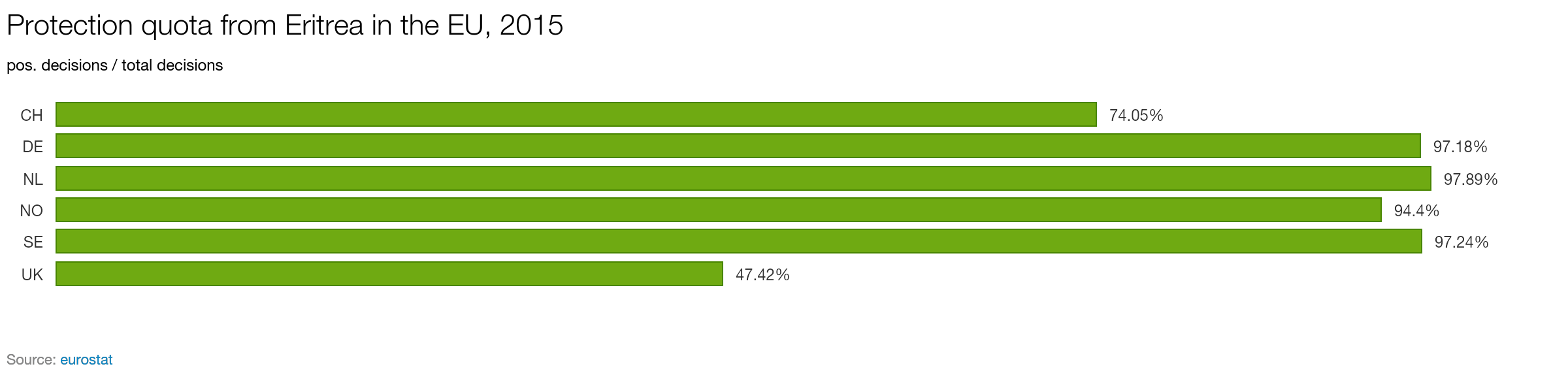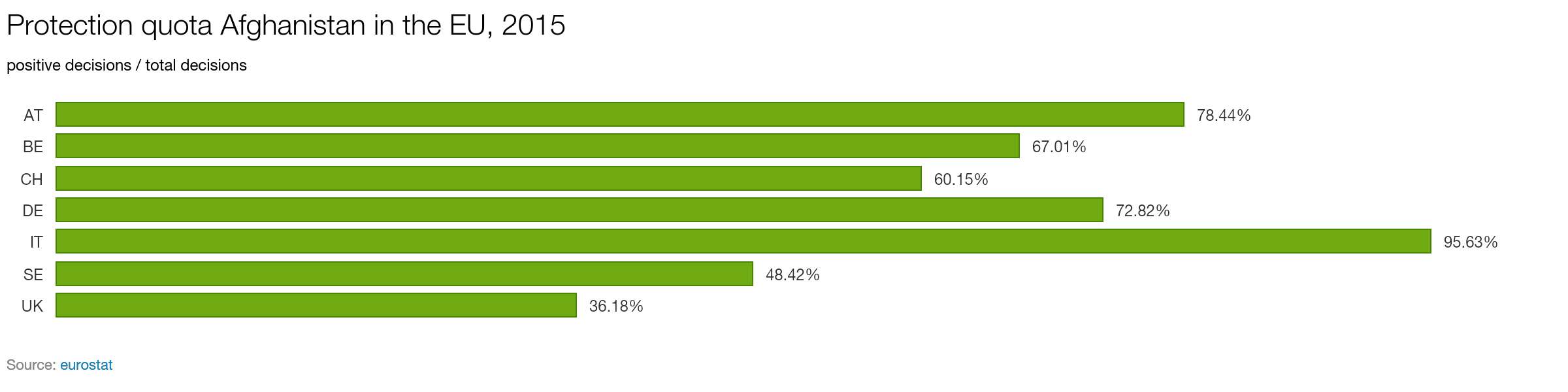 Serbien war also kein gutes Beispiel für einen europäischen Vergleich, das würde man besser von Bundesland zu Bundesland vergleichen. Das lässt sich mit Zahlen vom BAMF machen, und es gibt einen guten Artikel zu anderen Ländern: http://www.welt.de/politik/deutschland/article136479315/So-unterschiedlich-bewerten-die-Laender-Asylanträge.html. Wir bleiben aber in diesem Artikel europäisch, und stellen unsere Frage für andere Länder: Eritrea, Afghanistan und Pakistan.