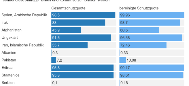 Die Schutzquote sagt aus, wie viele Flüchtlinge die Berechtigung erhalten, in Deutschland zu bleiben. In Prozent, also geteilt durch eine Gesamtzahl. Die Frage ist: Was ist die richtige Gesamtzahl?